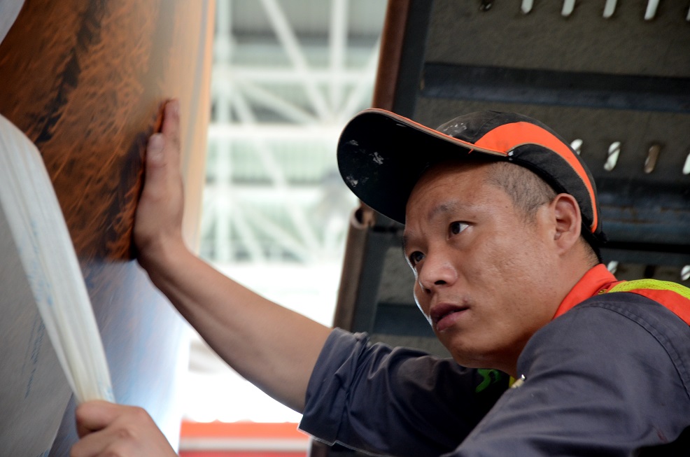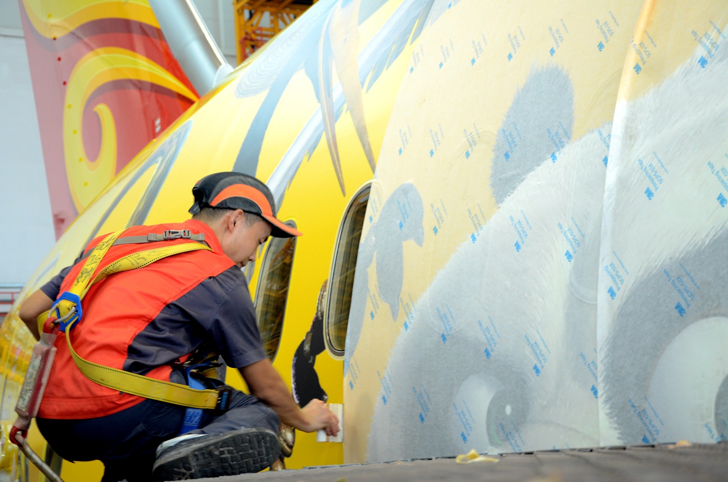当模板固定完成后,撕下图案外层的保护膜,让图案逐渐显现出来,在这个环节的操作上需要十分细致并且拿捏得当,因为一不小心就可能会破坏图案的效果。当然,这对于APC的机务们来说已经是驾轻就熟了。这位机务正在聚精会神小心翼翼地将保护膜撕下。