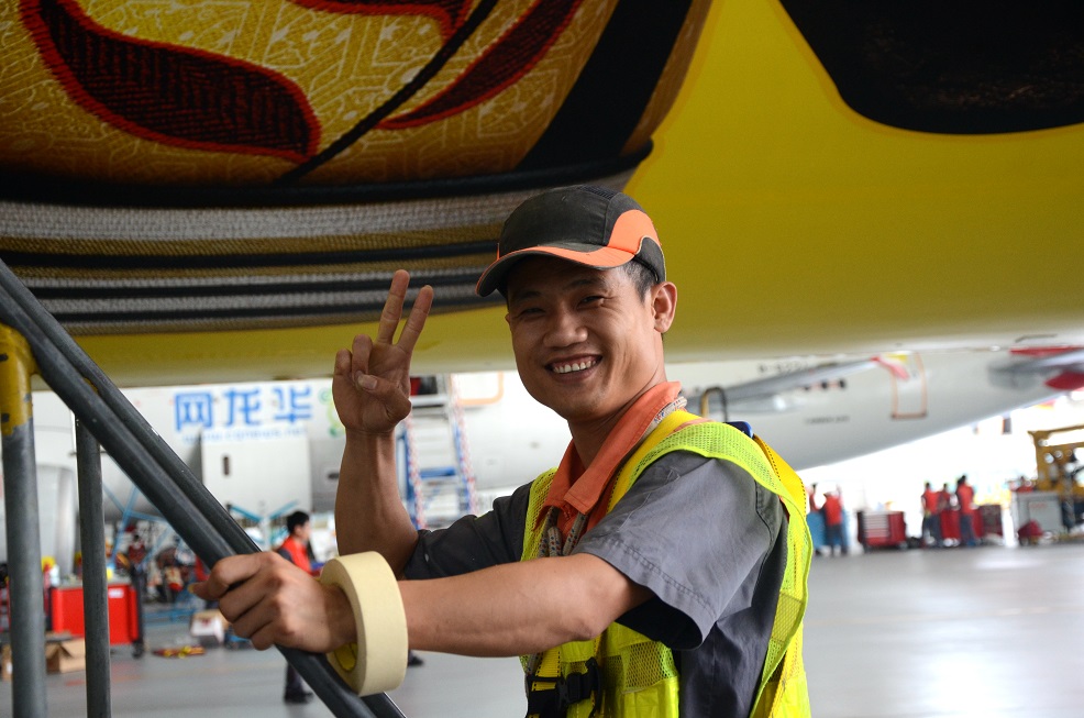 全黄色的机身配上鲜活灵动的卡通图案,APC再次给大家带来了一场视觉盛宴,令人为之惊叹。究竟是怎样的技艺高超,才有这样的美妙绝伦。这一次,就让小编带大家走进现场,看一看机务们是如何打造出这架“功夫熊猫”号的。