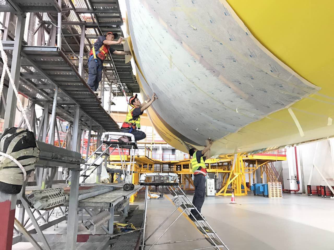 787的机身高达6米,施工过程中,还需要借助到高空车,用于完成位置较高处的贴膜工作。