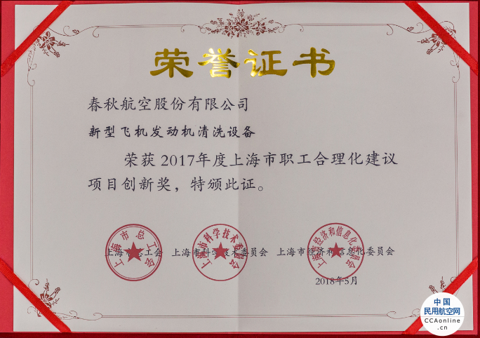 春秋航空自主研发的发动机水洗设备2017年取得合格证书,并且获得了当年上海市职工合理化建议项目创新奖。通过实际数据测算,经过清洗后一架飞机单位燃油消耗可减低0.4%,一架飞机一年可节省25吨的燃油,节能减排效果十分显著。春秋航空努力将这款物美价廉的新型发动机水洗产品向全行业推广,为行业的节能减排工作尽一份微力。