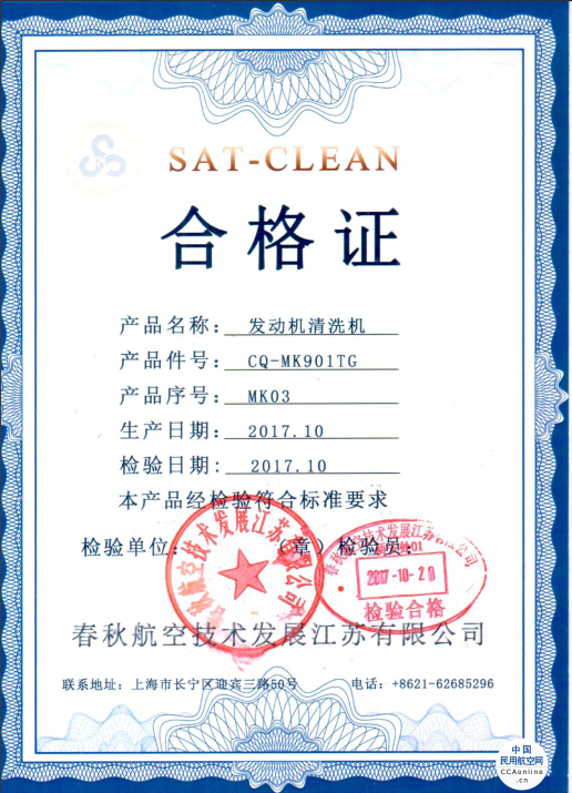 图3:春秋航空自主研发发动机水洗设备合格证
