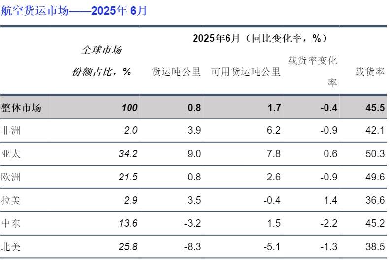 国际航空运输协会(IATA,简称“国际航协”) 2025年6月全球航空货运需求定期数据显示: