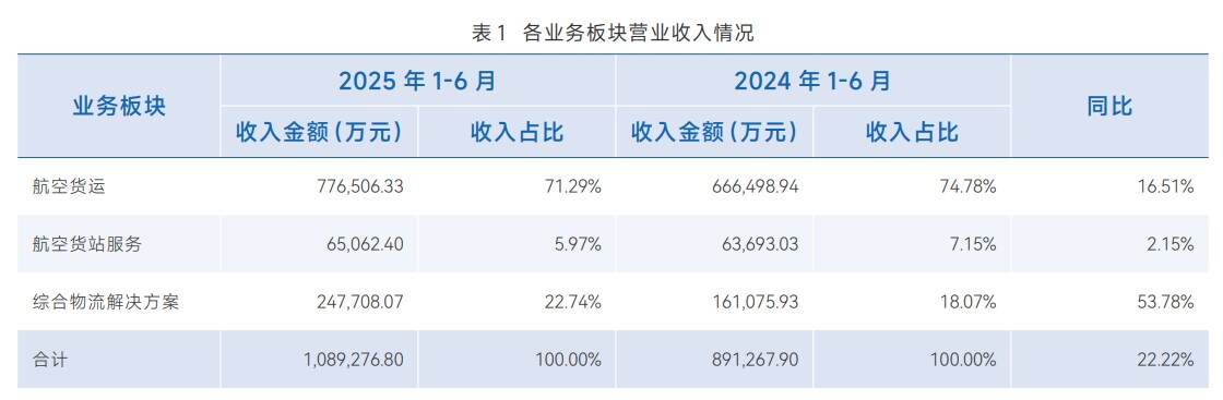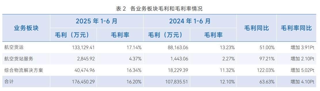 国货航表示,作为航空物流综合服务商,主营业务可分为航空货运服务、航空货站服务、综合物流解决方案三大板块, 2025年上半年实现主营业务收入108.93亿元,同比上升22.22%;实现毛利17.65亿元,同比上升63.63%,综 合毛利率16.20%,同比增加4.10Pt。2025年上半年航空货运板块收入增幅16.51%,成本增幅11.25%,毛利率增加3.91Pt,主要原因是2025年上半年公司机队规模和航线结构实现扩充和优化,新增运能有效投入,加之航空油料价格下降等因素带动,公司盈利能力同比实现明显增长。航空货站板块收入增幅2.15%,成本降幅0.05%, 毛利率增加2.10Pt,主要原因是通过推进货站平台化经营模式转型实现提质增效,并且货站布局与航线网络高度匹配,货站吞吐量持续增长,进而拉动效益提升。综合物流板块收入增幅53.78%,成本增幅45.07%,毛利率增加5.02Pt,主要原因是公司坚持守正创新,积极拓展航空物流价值链,扩大了跨境电商客户的合作规模。