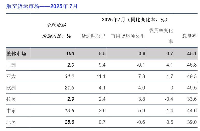 国际航空运输协会(IATA,简称“国际航协”) 2025年7月全球航空货运需求定期数据显示: