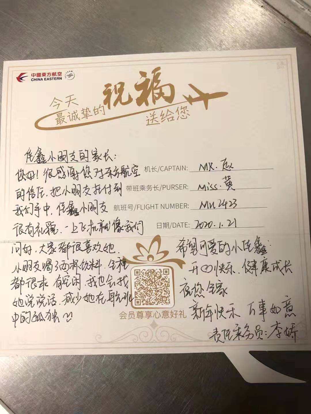 1月21日,东航MU2423从长春到西安的航班上有一名无人陪小旅客佳鑫,乘务员帮她安顿好行李,嘱咐她落地后不要先走,要等到乘务员把她交接给地面阿姨再走。小佳鑫很乖,乘务员给她拿了折纸小玩具,还帮她叠了一个桃心,她很喜欢。平飞后小佳鑫用完餐,乘务长怕她旅途中太孤独,就把她叫来服务间和她聊聊天。乘务员在一张卡片上给小佳鑫的父母写了一封信,告诉他们佳鑫在空中的生活,让佳鑫带给她的爸爸妈妈,小佳鑫说,自己经常一个人坐飞机,这是第一次收到乘务员阿姨给自己爸爸妈妈的信,说回去一定会给爸爸妈妈看。最后,小佳鑫提出和乘务员拍照留个纪念回家给父母看,小佳鑫和乘务员的笑脸定格在温馨的万米高空。(关向贞、罗逸飞、曾航、李娇)