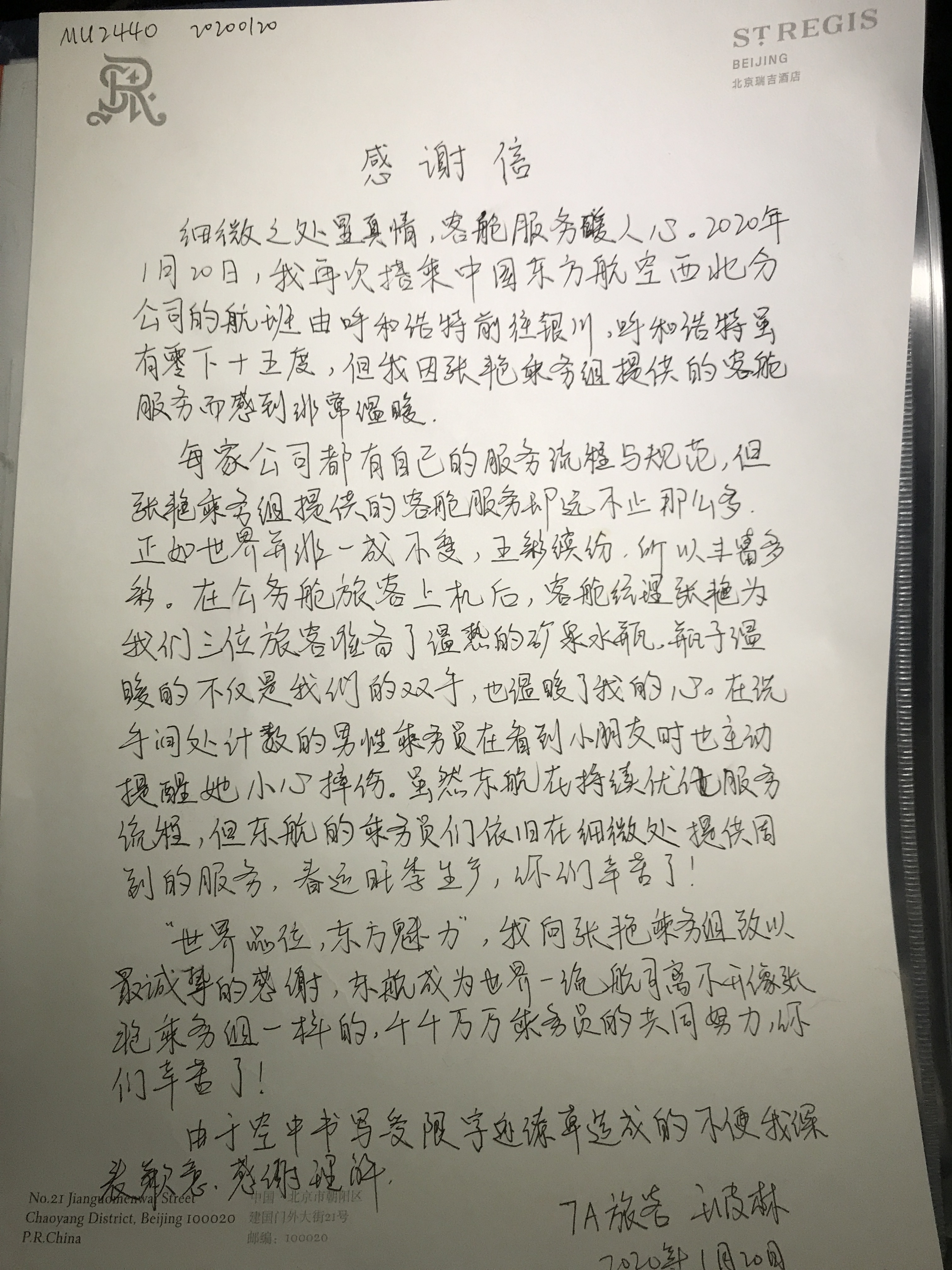 1月20日,东航西北分公司省级劳模、客舱经理张艳,带领乘务组执行MU2440航班从呼和浩特到银川。北方的冬天非常寒冷,公务舱旅客王先生一上机,张艳就为他送上灌了热水的矿泉水瓶让他暖手。一路上,王先生看到乘务组的每位成员都精神饱满,细致耐心地为每一位旅客服务,非常感动。下机时,他将一封感谢信交给了张艳,他说,“热水瓶不仅温暖了我们的双手,更温暖了我的心……我向张艳乘务组致以最诚挚的感谢。东航成为世界一流航司,离不开像张艳乘务组一样的千千万万乘务员的共同努力,你们辛苦了!”下机时,王先生与全体乘务组合影留念。