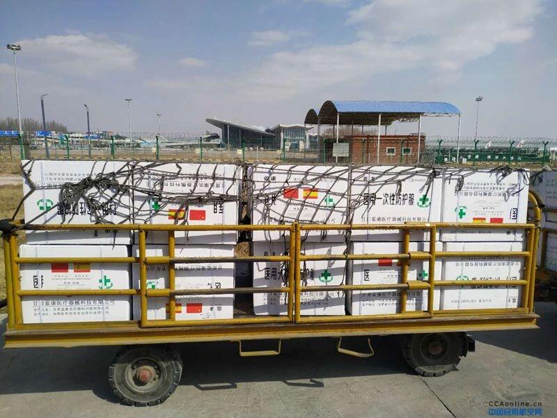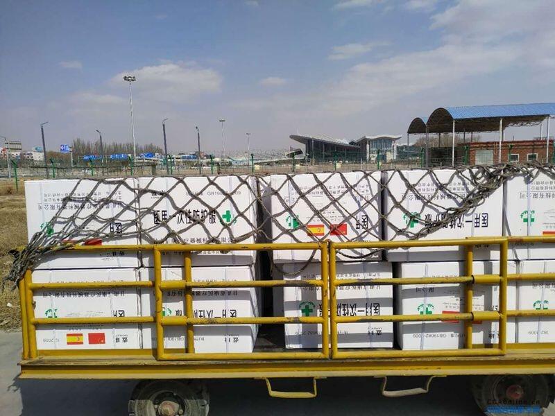 东航甘肃分公司三架航班分别于12:35、14:00、20:15起飞,共运送3085公斤“甘肃产”医用防护服2万件、KN95型医用防护口罩2万只、一次性医用口罩14万只等医用防护物资,分别经停上海发往西班牙纳瓦拉自治区、罗马尼亚阿尔巴县等我省国际友好省州和法国热尔布博瓦市及法国“一带一路”美丽乡村联盟等友好组织,以支持和帮助他们抗击新冠肺炎疫情。