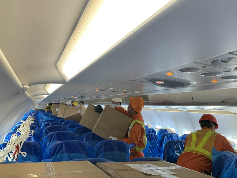 4月12日中午11点,地服部组织人员上机进行“试装”,实地丈量货物长度和宽度,一个座椅上大概能装几件,将保护绳线、网兜进行再次操作,确保货物合规、安全运输。