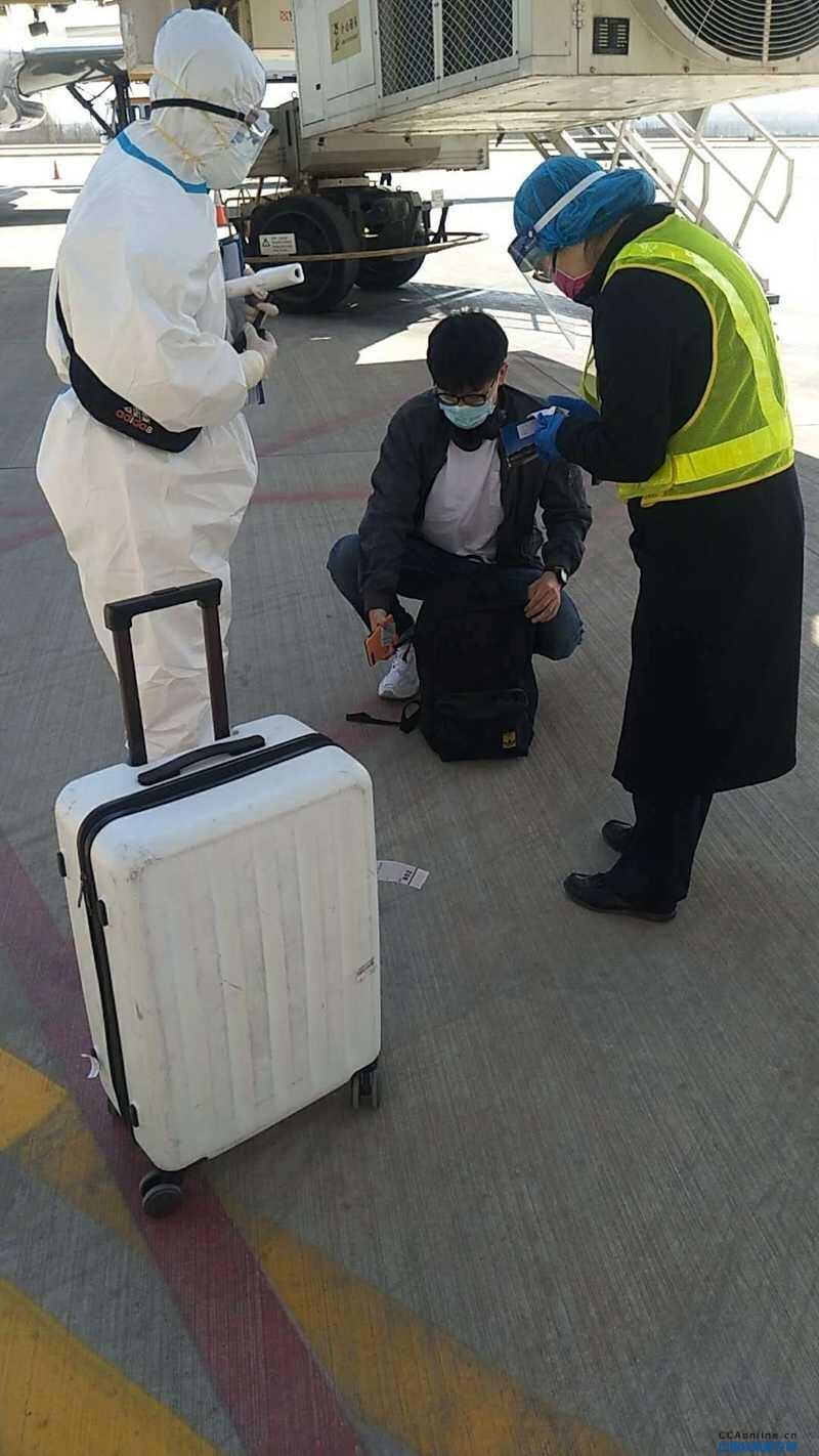 飞机落地后,若有特殊旅客,先由机场疾控人员先上机排查,候机工作人员协助确定排查人数,以及旅客托运行李件数,确保其他旅客安全有序下机。