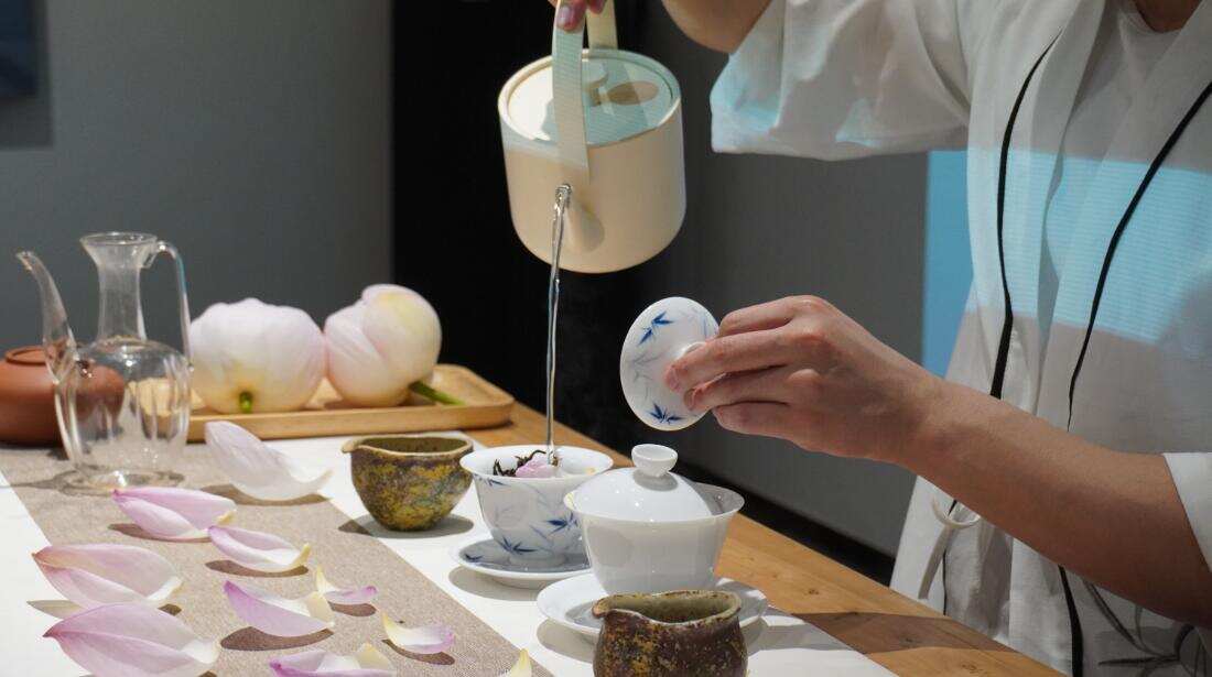 “予独爱莲之出淤泥而不染,濯清涟而不妖。” 宋代周敦颐的《爱莲说》描述荷花“中通外植,不蔓不枝,香远益清,亭亭净植。”荷花自古以来为文人雅士所称道,也有清廉自洁之意,而观荷花、纳凉消暑更是别有一番风味。此次活动内容以诠释中国诗词、品茗、禅意花道、分享感悟为四大板块。品茗出自《世说新语·任诞》,是饮茶的雅称。里格177艺展中心为东航四川分公司女职工打造了人、茶、器、物、境的茶道美学空间,课程一开始,飘逸着荷香的茶叶沁人心脾,众人沉浸在氤氲茶雾和茶香四溢的氛围中,通过品茶和老师讲解,更为了解中华传统茶道文化,同时也学习了荷花茶冲泡的方式和技巧