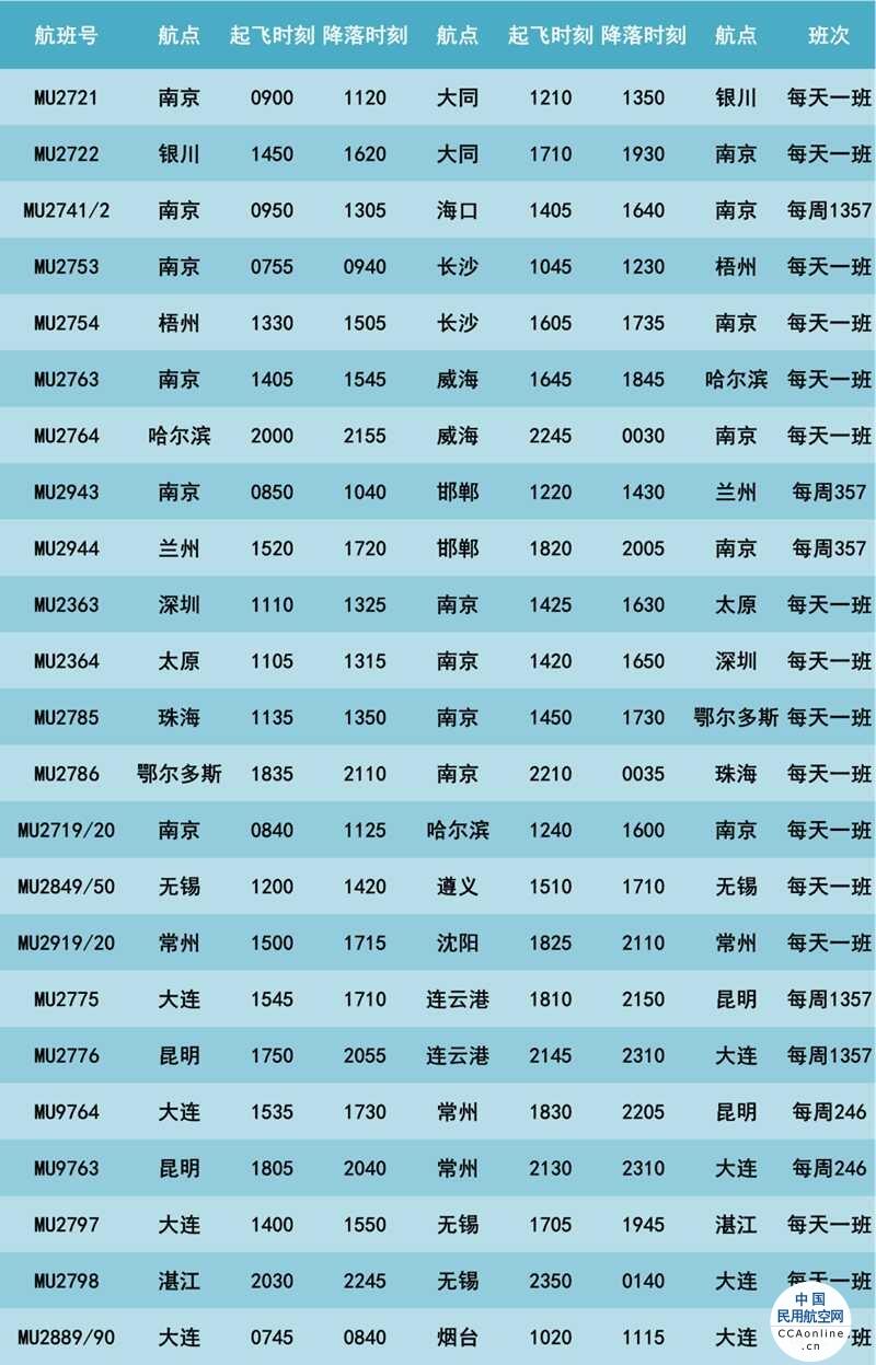 南京地区新开8条航线,分别为:南京-大同-银川、南京-海口、南京-长沙-梧州、南京-威海-哈尔滨、南京-邯郸-兰州、深圳-南京-太原、珠海-南京-鄂尔多斯、南京-哈尔滨;