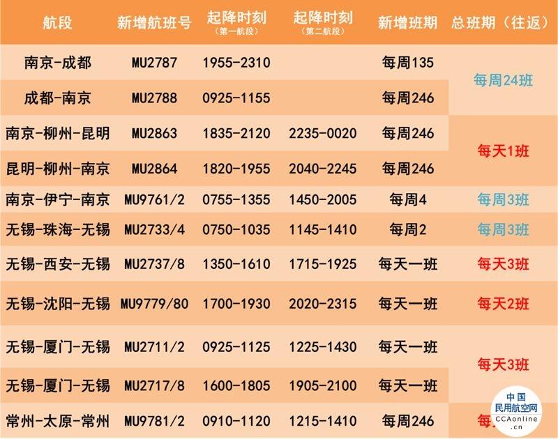 南京地区加密3条航线,加密后:南京-成都每天3-4班、南京-柳州-昆明每天1班、南京-伊宁每周3班;