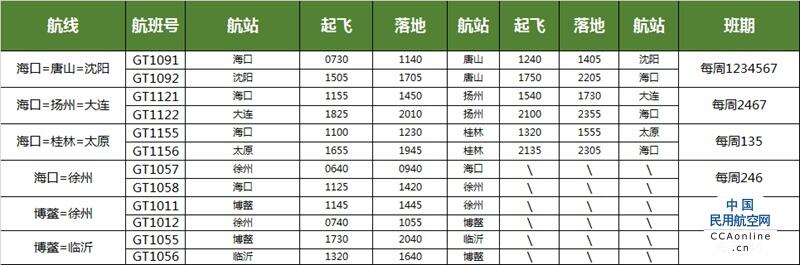 值得一提的是,6条航线中海口=桂林=太原、海口=扬州=大连、海口=徐州、博鳌=临沂等4条均为新开航线,博鳌=徐州航线为加密运行航线。其中,博鳌=临沂航线则为桂林航空独飞航线,此条航线的开通将填补博鳌与临沂间航线的空白,进一步丰富和完善海南与山东之间的航线网络。