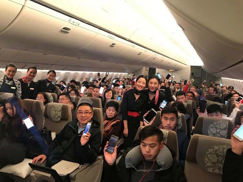 (全民航最早起飞的跨零点“空中开机”航班——17日中午起飞的MU587上海纽约航班旅客共同迎来18日0点空中开机时刻)