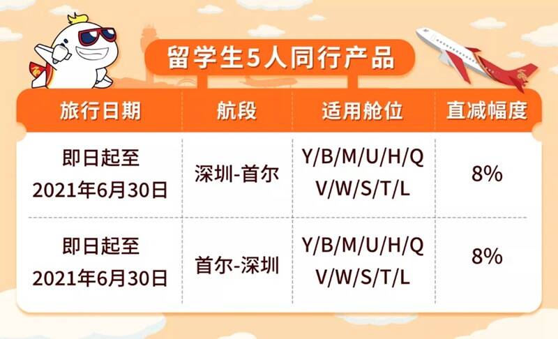 即日起至2021年6月30日,深圳=首尔航线的留学生旅客,在同一日期、同一航班成行,3-9人同时预订经济舱单程机票时,可享指定舱位票面直减5%-8%的优惠。