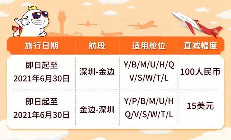 另外,2021年3月10日-6月30日,符合购票条件的旅客预订深圳-金边或金边-深圳的单程机票时,可享专属优惠,指定舱位票面直减100元。