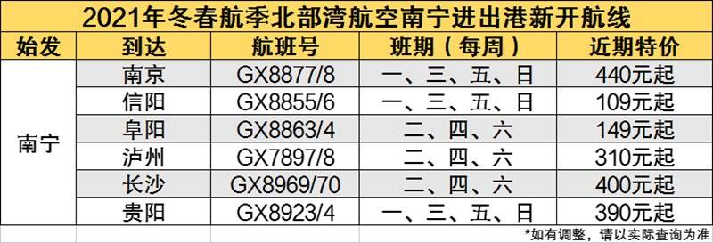 (通讯员 杨茜茜 高杨)作为广西首家本土航空公司,北部湾航空一直致力于广西航空旅游业的发展。10月31日起,北部湾航空将开始执行2021—2022年冬春航班计划,为能进一步为本地旅客带来更优质的服务、提供更多样的出行选择,北部湾航空将新开南宁直飞南京航线,并恢复执行南宁=信阳、南宁=阜阳、南宁=贵阳、南宁=泸州、南宁=长沙等五条航线。