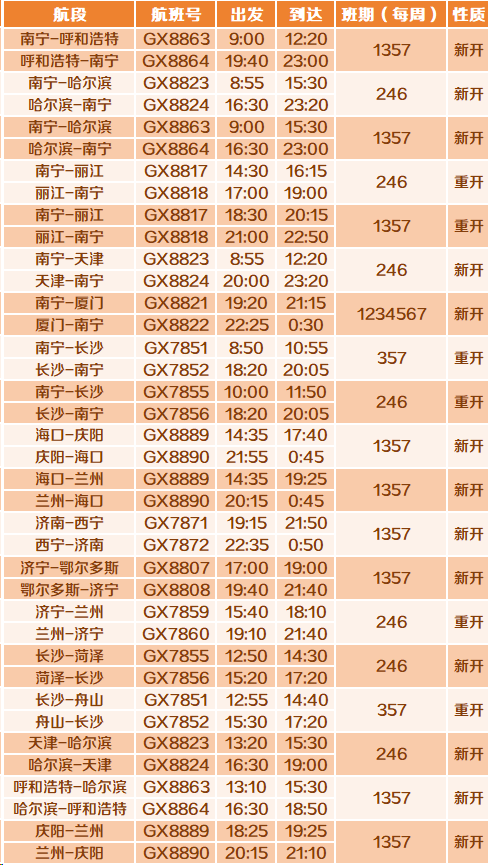 北部湾航空2025夏秋航季新开/重开22条热门航线 航空运输要闻 航线航班 3月18日 编辑 通讯员mk 取消关注 关注 私信 全民航将于3月30日进入夏秋航季,随着换季日期日益临近,北部湾航空新增及恢复了22个热门及特色航段,覆盖哈尔滨、呼和浩特、厦门、丽江、舟山、西宁、菏泽、鄂尔多斯、南阳、庆阳等多个热门旅游目的地,满足旅客多样化的出行需求,具体航线信息详见下表。 航班换季北部湾航空