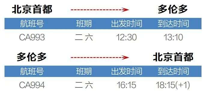 国航加拿大航线再添新选择,解锁北京直通多伦多 航空运输要闻 航线航班 4月11日 编辑 通讯员mk 取消关注 关注 私信 2025年5月20日起,国航将开通北京首都⇌多伦多直达航线,航班号为CA993/4,班期为每周二、六,由波音777-300ER客机执飞。此前国航已开通北京首都-温哥华航线,北京首都-多伦多航线开通后,国航飞往加拿大航线将增至2条,为您的出行提供更多选择。 具体信息如下: *以上时间均为当地时间,具体情况以实际执行为准。 国航国际航线航班
