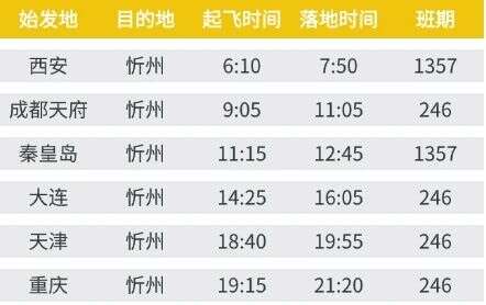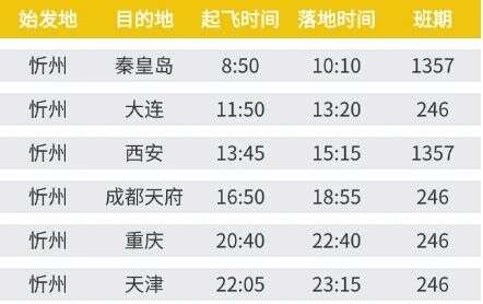 华夏航空忻州⇌重庆/成都等6城航线升级 航空运输要闻 航线航班 25年5月6日 编辑 通讯员mk 取消关注 关注 私信 5月1日起 忻州起飞 从晋北古城到滨海浪漫 从巴渝麻辣到长安古韵 忻州出发6城航班优化 更密班次、更优时刻 带你轻松直达热门目的地 具体时刻是怎样的呢? 赶紧来看看吧! 忻州进出港航班时刻 忻州出港航班时刻 - 以上区域航线为计划航线,请以官网实际查询为准 - 忻州进港航班时刻 - 以上区域航线为计划航线,请以官网实际查询为准 - 华夏航空
