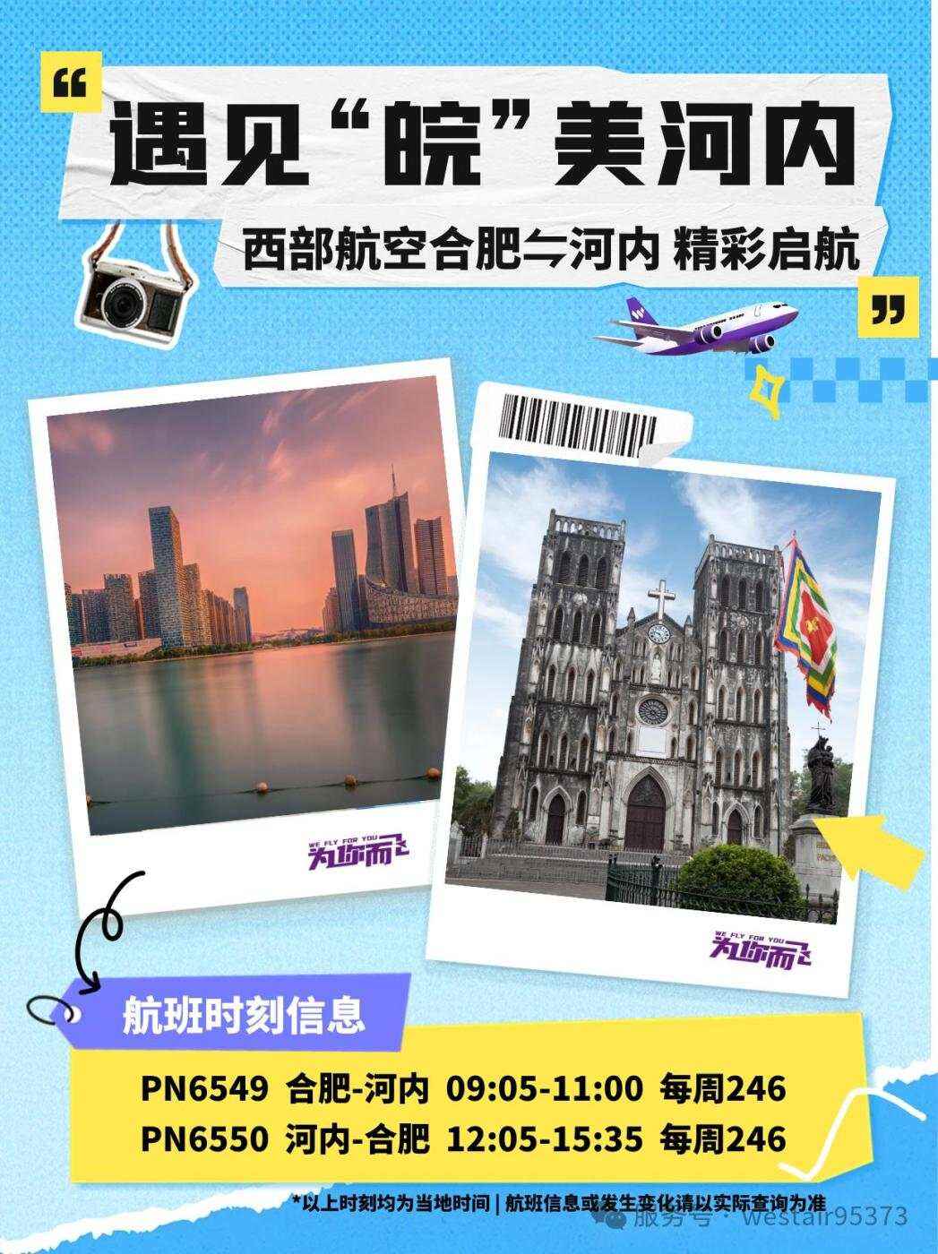 西部航空开通合肥直飞河内航线 航空运输要闻 航线航班 6月4日 编辑 通讯员mk 取消关注 关注 私信 2025年6月12日 西部航空在合肥与河内之间牵起一根银线3小时足够把巢湖的涟漪折叠成下龙湾的海浪把地铁报站声替换成越南语的摩托轰鸣 合肥⇌河内 每周3班合肥✈️河内丨09:05 - 11:00河内✈️合肥丨12:05 - 15:35 航旅资讯西部航空国际航线航班