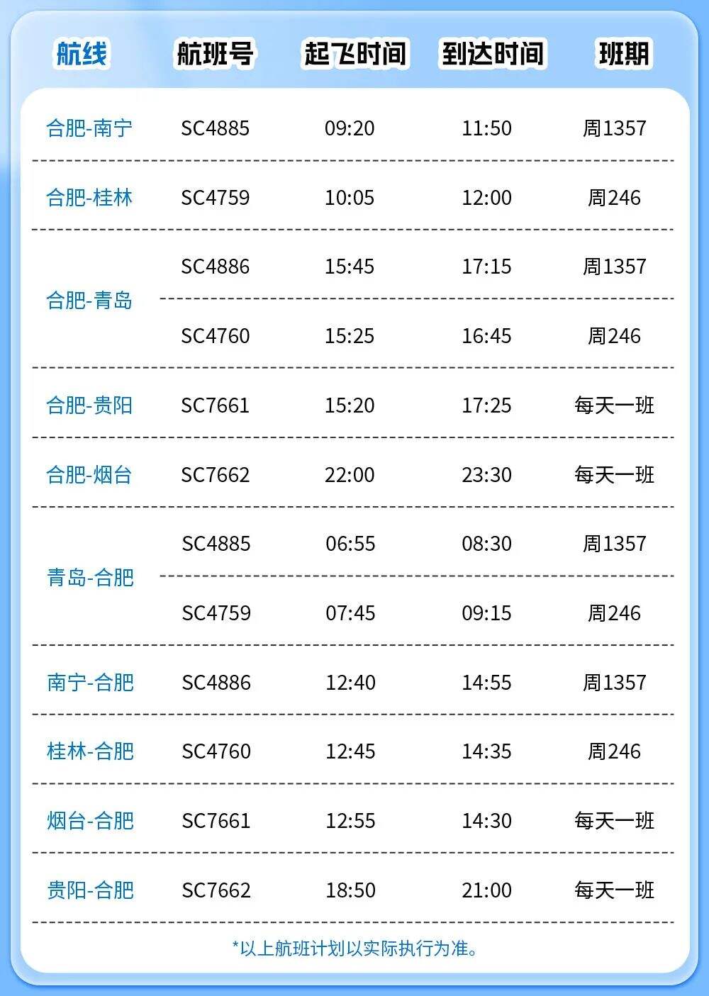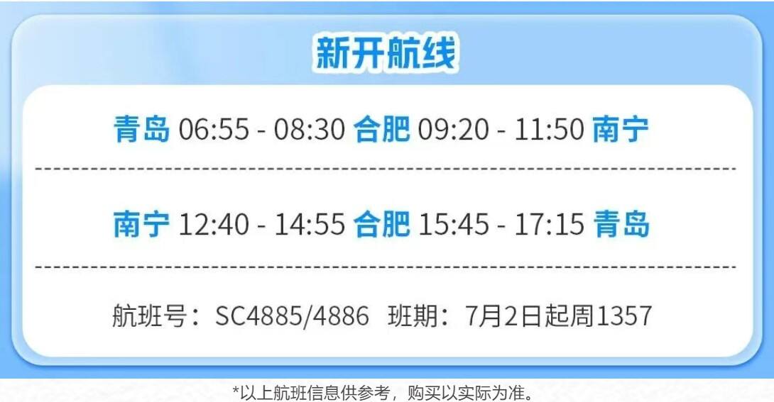 7月1日起山航新开多条航线 航空运输要闻 航线航班 6月24日 编辑 通讯员mk 取消关注 关注 私信 炎夏的热浪悄然弥漫,寻觅一方沁凉胜境的心意正切。7月1日起,山航新开济南⇌长白山、重庆⇌济南⇌延吉热门航线。 7月2日起,山航全新开通青岛⇌合肥⇌南宁航线,以万米银翼串联起青岛的粉黛碧海、合肥的墨韵书香,终抵南宁的绿意秘境。 暑期放飞·合肥进出港航线 民航暑运航旅资讯山东航空