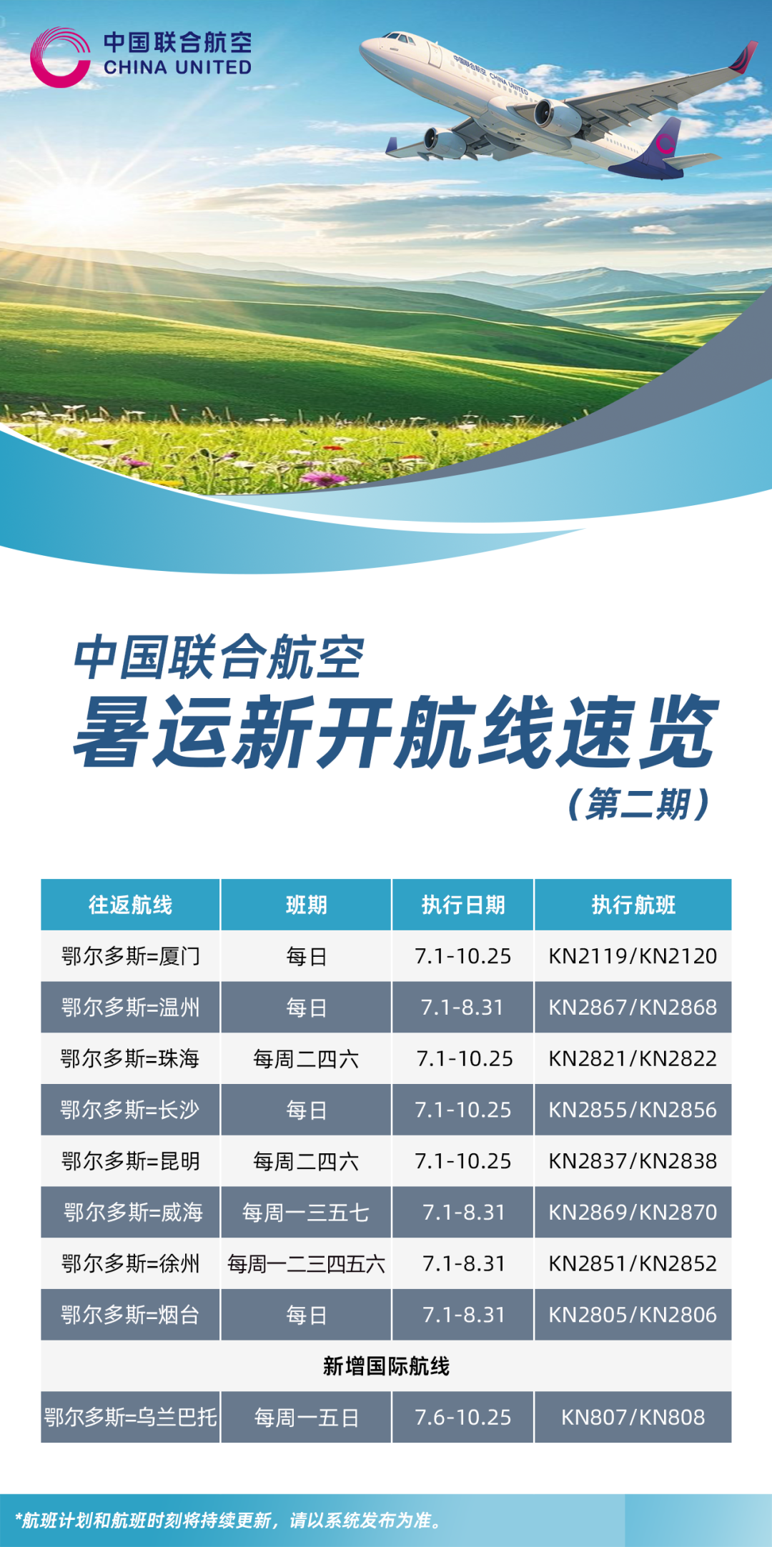 鄂尔多斯往返 中联航暑运新开航线 航空运输要闻 航线航班 6月27日 编辑 通讯员mk 取消关注 关注 私信 这个夏天 中国联合航空为你准备了更多惊喜航线 带你探索更多没有见过的风景 希望你的每一程旅途 都能成为逃离日常的浪漫出口 第二期新开航线来啦 随着天气转热,暑期跨省游增多,热门城市及景区人流量增大,出游前请合理规划出行时间和线路,尽量避免高峰时段出行,并关注天气信息,及时查看出行航班状态,祝您暑期旅行愉快! 民航暑运航旅资讯中联航