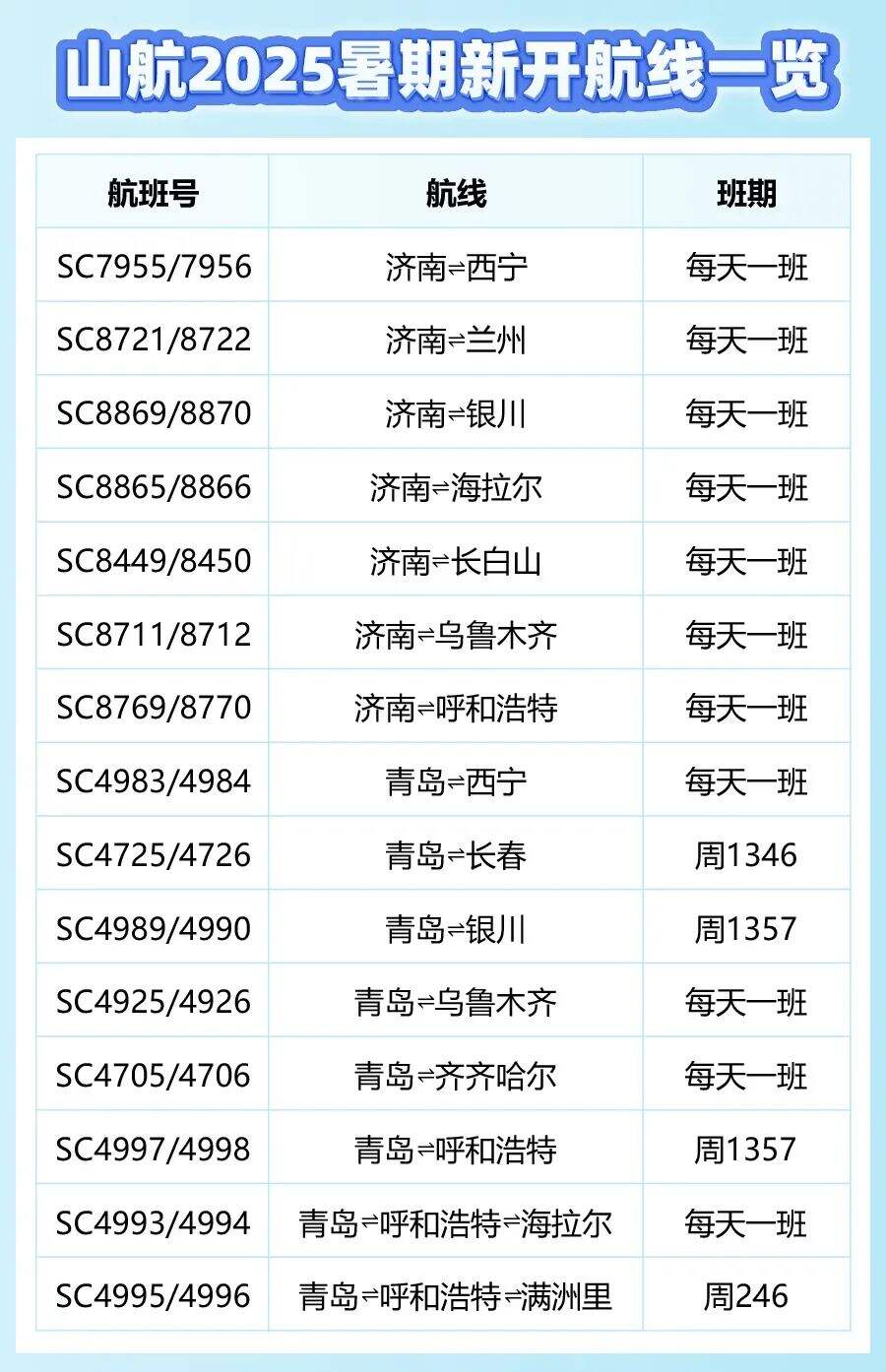 山航暑期新开62条航线