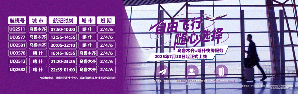 乌鲁木齐=喀什航线,是乌鲁木齐航空新疆区域重要航线之一。此次推出“乌鲁木齐=喀什”航空快线,将进一步提升乌鲁木齐航空航线运营品质,加强新疆首府乌鲁木齐与丝路重镇喀什之间的航空联系,并保障两地辐射地区的航空运输需求,为商务、旅游、探亲等旅客打造优质出行服务。广大旅客可通过乌鲁木齐航空官网、海南航空APP、各大机票销售平台或拨打客服热线95334查询、购票。