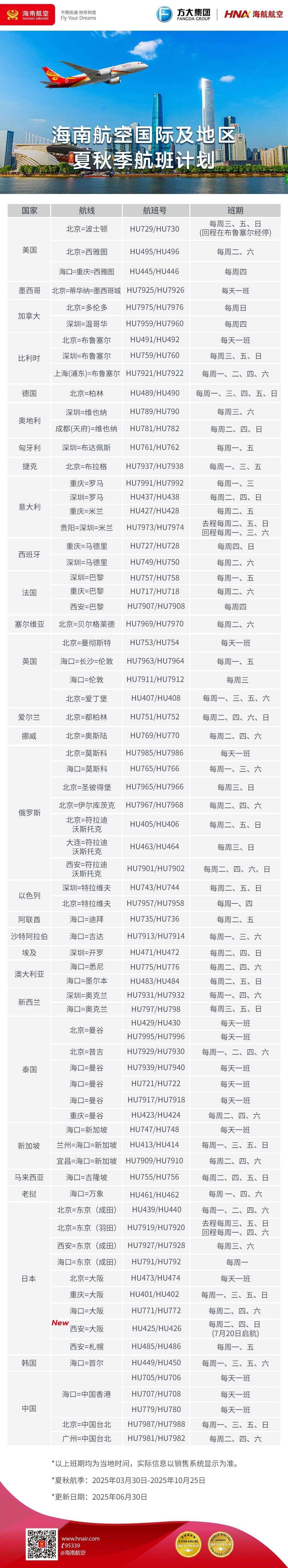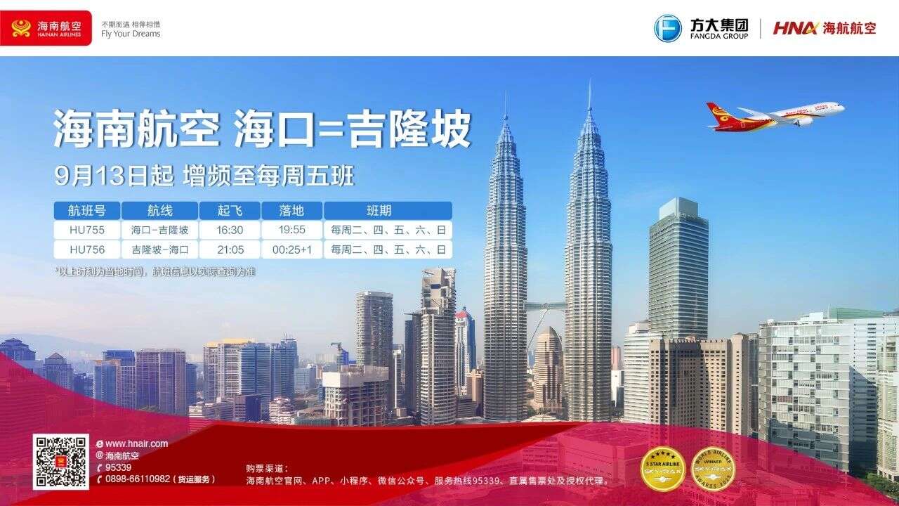 9月13日起,海口=吉隆坡航线将增频至每周五班!