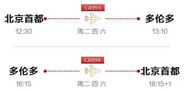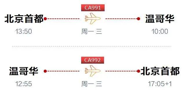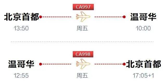 国航加拿大航线即将增班 航空运输要闻 航线航班 8月15日 编辑 通讯员mk 取消关注 关注 私信 2025年8月27日起,国航加拿大航线增班: 北京首都-温哥华航线,CA991/2由每周一班增至每周两班,班期为每周一、三。 北京首都-多伦多航线,CA993/4由每周两班增至每周三班,班期为每周二、四、六。 增班后,国航加拿大航线每周往返达到12班,为您的出行提供更多选择。 具体信息如下: *以上时间均为当地时间,具体情况以实际执行为准。 国航航旅资讯国际航线航班