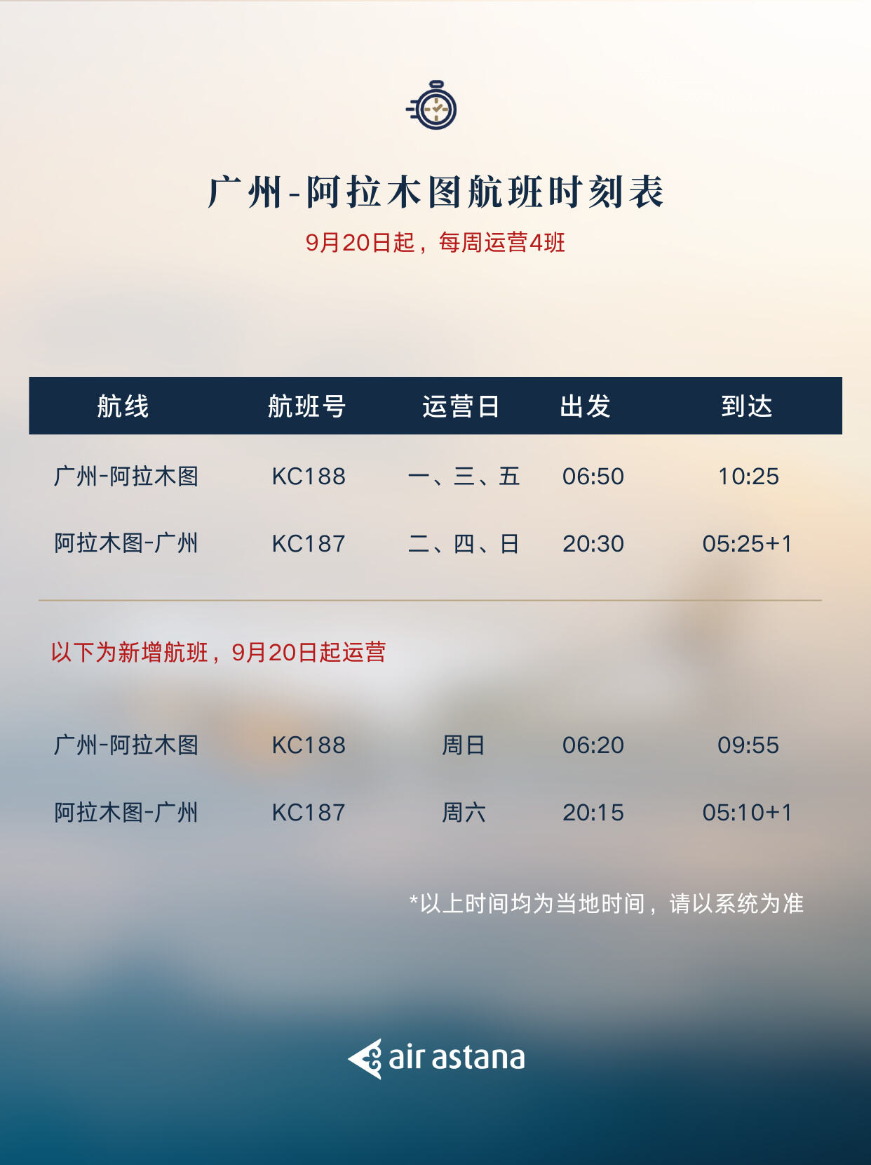阿斯塔纳航空将增班广州-阿拉木图航线 航空运输要闻 航线航班 8月28日 编辑 通讯员mk 取消关注 关注 私信 好消息!阿斯塔纳航空 广州-阿拉木图航线自2025年9月20日起将每周新增一班增班后将达到每周四班的运力水平 航旅资讯阿斯塔纳航空国际航线航班
