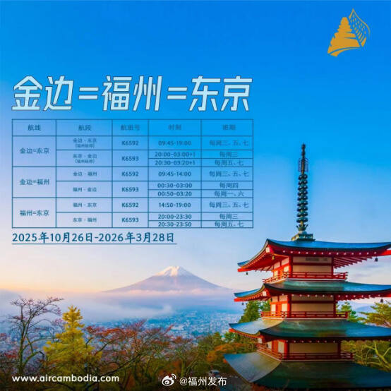 据了解,该航线计划自今年10月26日起每周运营三班,采用空客A320系列客机执飞,航班号K6592/3。目前,“金边=福州=东京”航线已开启预售,旅客可通过柬埔寨国家航空官网、各大售票平台及授权代理商查询购票。