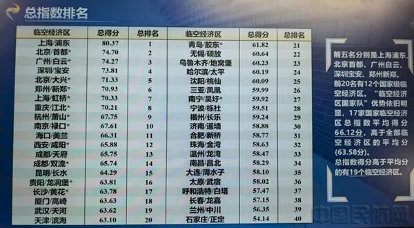 从总指数评价结果来看,2024年我国重点临空经济区整体发展平稳,排名变动幅度小,前20名与上年基本一致,其中4个临空经济区位次不变、10个临空经济区仅变动1个位次。上海浦东、北京首都和广州临空经济示范区位列前三,深圳、北京大兴、郑州航空港区、上海虹桥、重庆临空经济示范区位居第四至第八位。这8个临空经济区总指数得分均超70分,与后续排名的临空经济区形成显著的领先优势,头部引领效应凸显。此外,太原、呼和浩特、长春、兰州、石家庄临空经济区列榜单后五位。