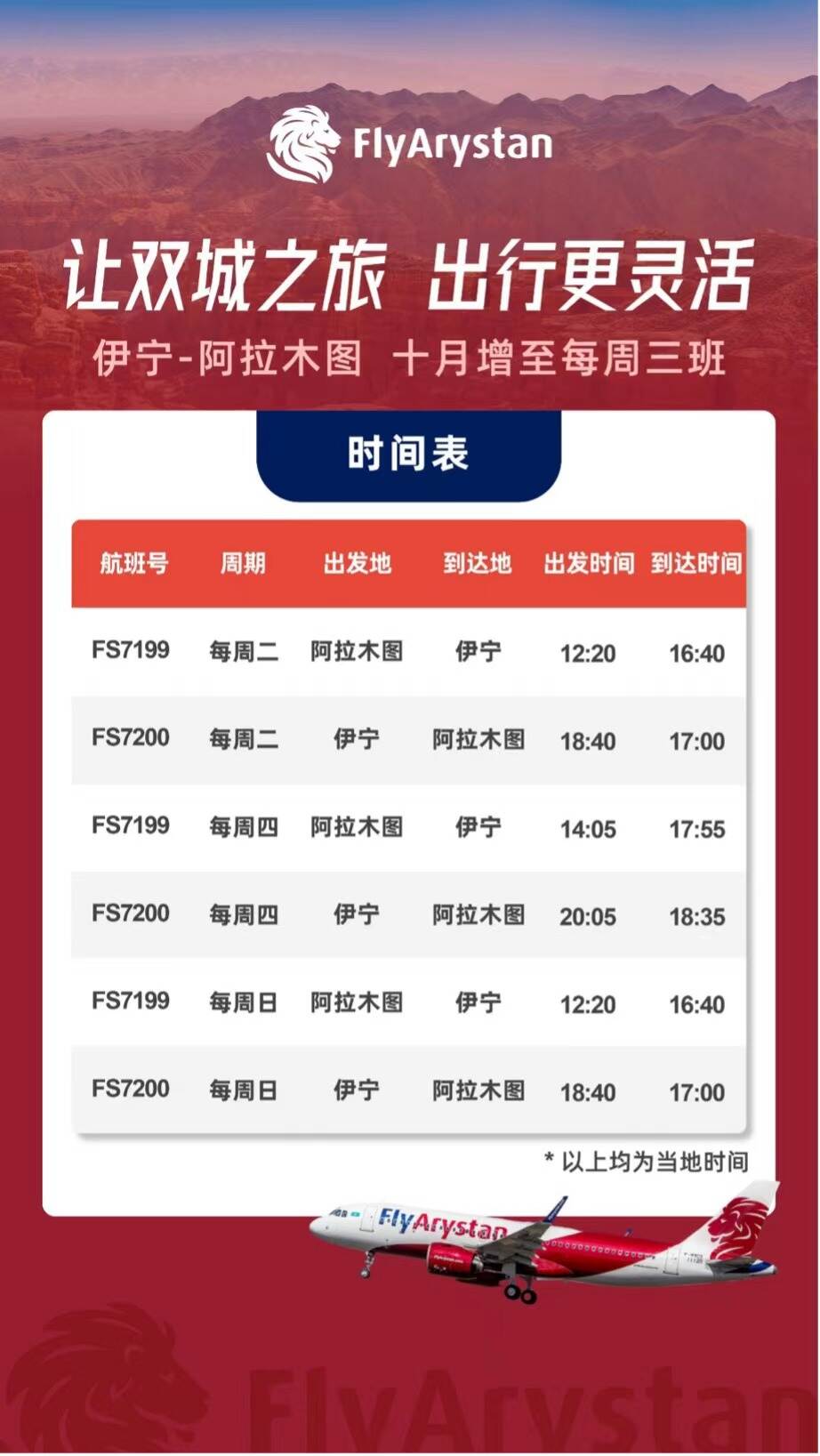 即日起,旅客可通过飞狮航空官方手机应用程序或官网(www.flyarystan.com)预订截至2025年10月23日的阿拉木图-伊宁航班机票。