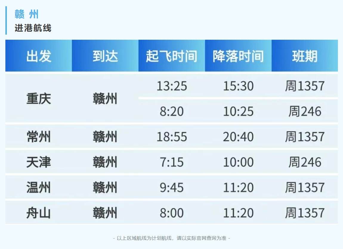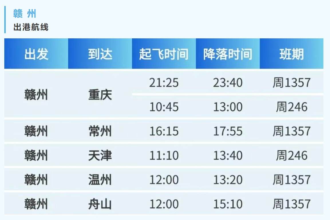 赣州出发,通达5座热门城市 航空运输要闻 航线航班 10月11日 编辑 通讯员mk 取消关注 关注 私信 10月26日 华夏航空将执行冬春航班飞行计划 新航季从赣州出发 新开重庆、常州、天津、温州、舟山 5条热门航线 单程票价低至250元起 等你来体验! 华夏航空航班换季赣州机场