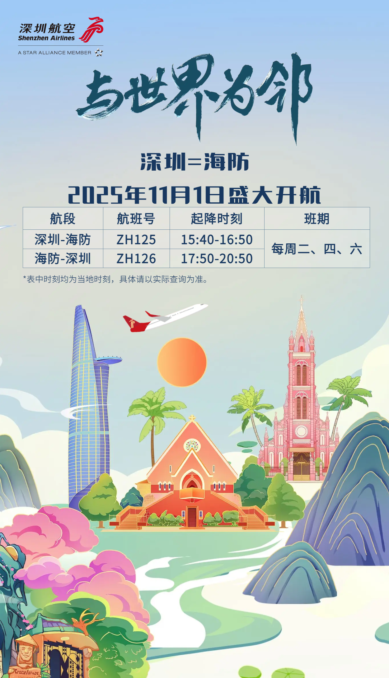 深圳⇄海防直飞航线11月启航,玩转越南小众海岛 航空运输要闻 航线航班 来源:深圳航空 10月13日 编辑 通讯员mk 取消关注 关注 私信 深航新航线速递! 11月1日,深圳⇌海防航线正式开航 一起打卡吉婆岛蓝海 漫步法式风情老街 开启一段融合东西方风情的独特假期~ 更多出行新惊喜已在路上! 12月22日,深圳⇌墨尔本航线盛大开航 带你穿越南半球 深圳航空国际航线航班