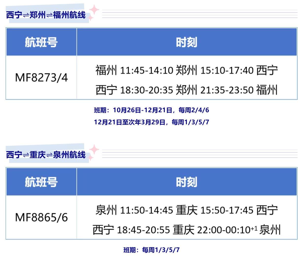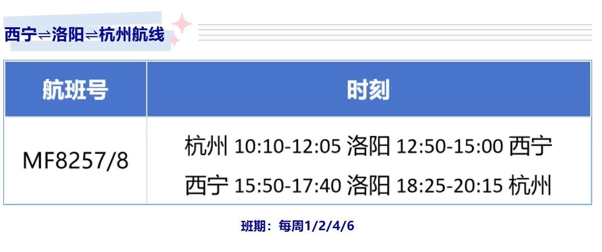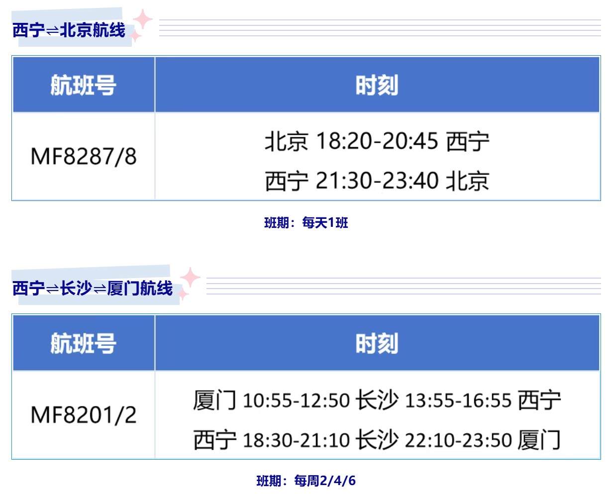 厦航新开、复航多条西宁航线 航空运输要闻 航线航班 10月13日 编辑 通讯员mk 取消关注 关注 私信 10月26日起, 厦航复航、新开多条西宁航线! 新开西宁⇌郑州⇌福州、 复航西宁⇌北京、西宁⇌洛阳⇌杭州航线, 续飞西宁⇌长沙⇌厦门、 西宁⇌重庆⇌泉州航线 航班换季厦门航空