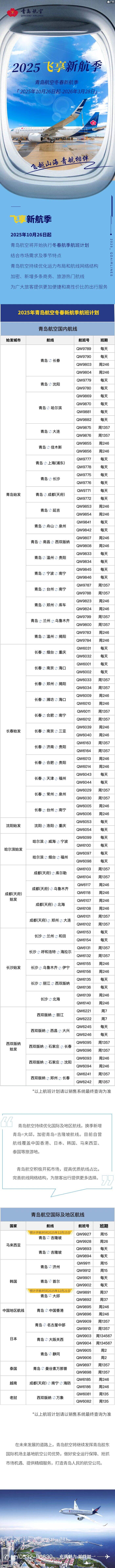 2025年青岛航空冬春新航季航班计划发布 航空运输要闻 航线航班 14小时前 编辑 通讯员mk 取消关注 关注 私信 相关推荐: 新航季南航将在哈新增、加密航班600余班 2025冬春换季 东航在西安新开加密多个航线 东航甘肃分公司开启秋冬航班运行 青岛航空换季新增两条国际航线 华夏航空冬春换季新开航线一览 青岛航空航班换季