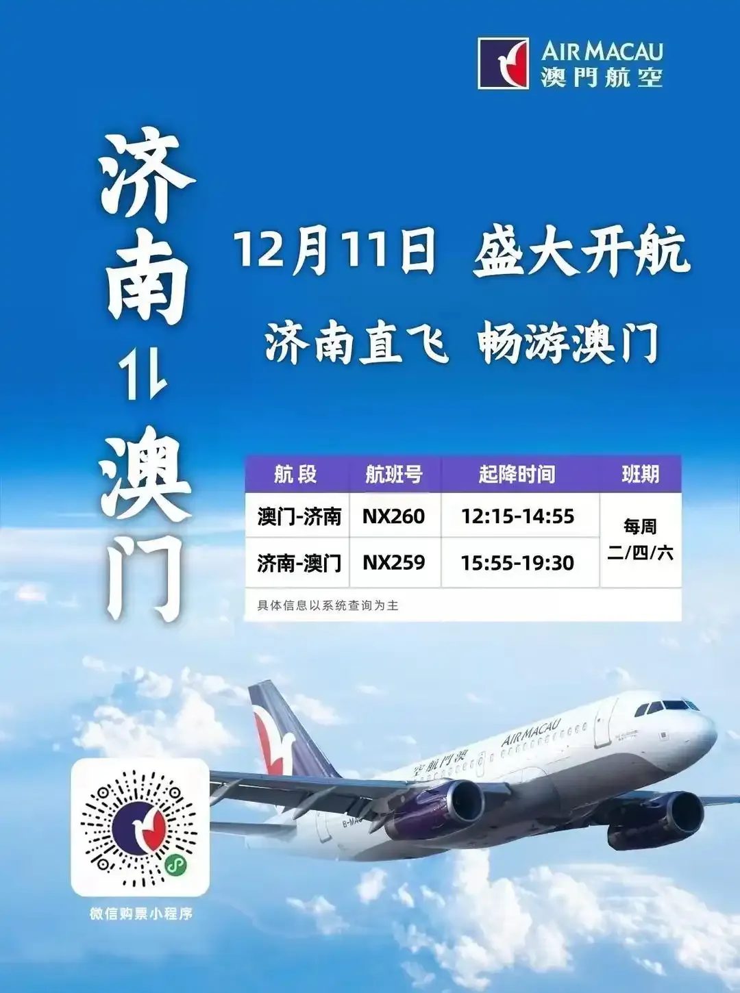 澳门航空济南⇌澳门直飞航线将于2025年12月11日正式启航,该航线是澳门航空在山东省开通的第二条直飞中国澳门的航线,标志着鲁澳两地经贸文化交流迈入新阶段。作为连接山东与中国澳门的重要空中桥梁,该航线每周二、四、六各运营一班,中国澳门直飞济南的NX260航班时刻为12:15-14:55、济南直飞中国澳门的NX259航班时刻为15:55-19:30,单程飞行时间约2.5小时,为旅客提供高效便捷的出行选择。