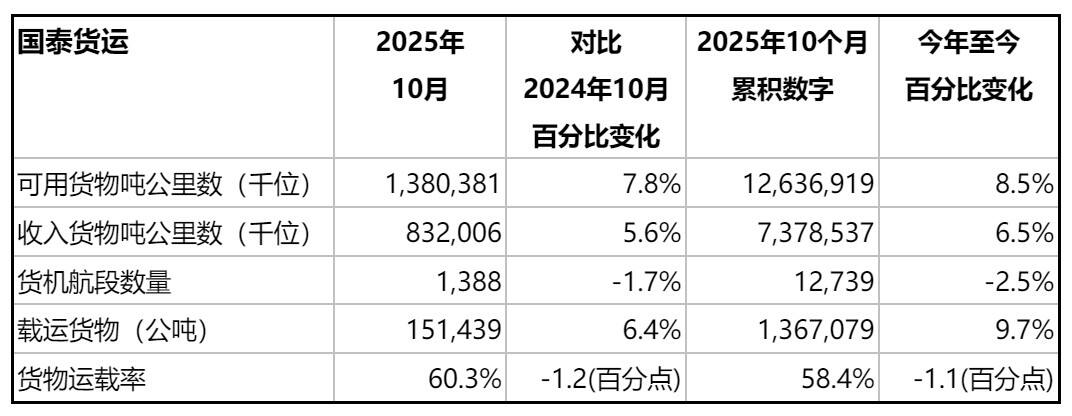 国泰货运于2025年10月的载货量较2024年同月增加6%,可用货物吨公里数按年增加8%。在2025年前十个月,载货量较去年同期增加了10%。