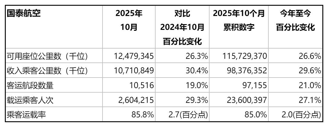 国泰航空于2025年10月份的载客量较2024年同月增加29%。可用座位公里数按年增加26%。在2025年前十个月,载客量较2024年同期增加了27%。