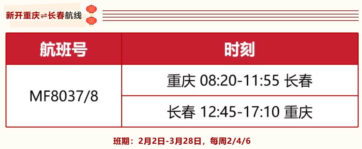 厦航春运新开多条国内航线 航空运输要闻 航线航班 来源:厦门航空 1月16日 编辑 通讯员mk 取消关注 关注 私信 厦门航空春运新开多条航线, 为你描绘冬春交替的诗与远方! 或是飞往冰雪幻境,或是飞往暖阳海岸, 2026,与你共赴新程! 厦门航空2026春运