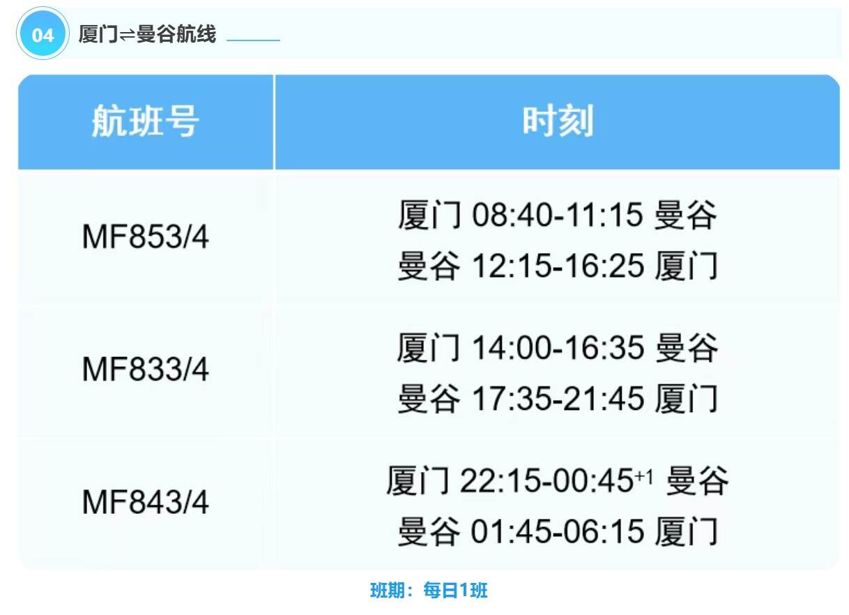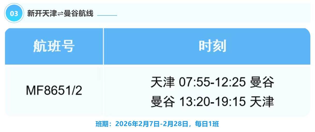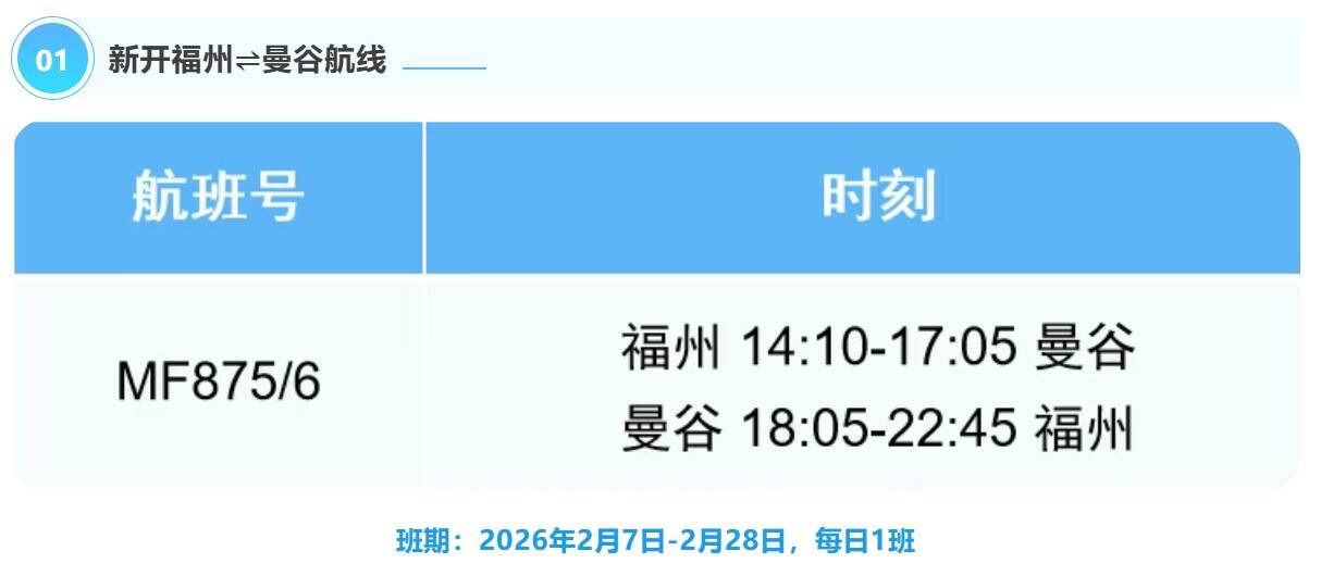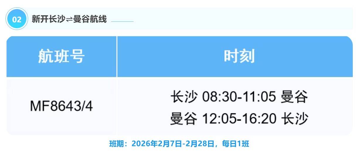 厦航春运新开多条曼谷航线 航空运输要闻 航线航班 1月21日 编辑 通讯员mk 取消关注 关注 私信 春运期间厦航新开多条曼谷航线! 2026年2月7日-2月28日, 新开福州⇌曼谷航线,每日1班, 新开长沙⇌曼谷航线,每日1班, 新开天津⇌曼谷航线,每日1班。 更多城市方便直飞,快跟着厦航一起打卡曼谷! 相关推荐: 厦航春运加开冰雪航线,带你解锁雪国体验 最新汇总!中国航司已取消51条日本航线 厦门航空国际航线航班2026春运