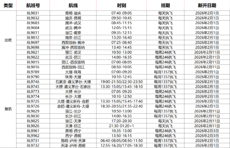 此次航线优化,祥鹏航空重点聚焦昆明、大理、丽江、腾冲、西双版纳等云南核心旅游城市,加密热点航线执飞频次。其中,昆明=迪庆、腾冲=武汉、丽江=南京等航线实现每日稳定执飞,大幅提升了滇西北、滇西南与华中、华东地区的通达性;丽江=武汉等航线也新增每周多班执飞计划,满足旅客探亲、旅游的双向流动需求。在航线拓展方面,丽江=天津、昆明=西宁等航线的复航,进一步完善了云南与京津冀、西北等区域的交通网络,让跨区域出行更具灵活性。