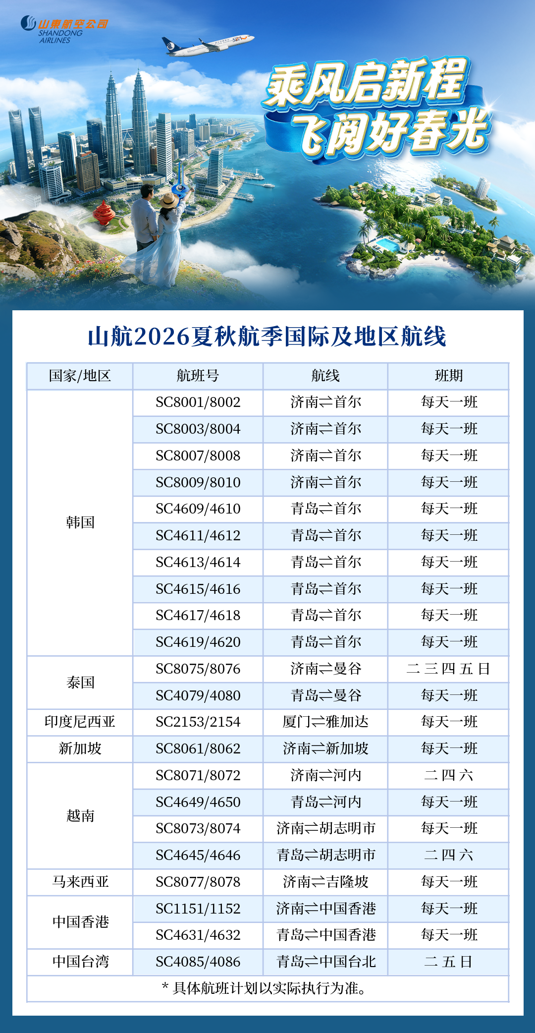 2026年夏秋航季,山航将持续优化航线网络、提升服务品质,助力旅客畅行全国、联通世界。查询航班信息或预订机票,欢迎登录山航官网(www.sda.cn)、下载山东航空APP或使用山航官方小程序,如需咨询可拨打山航24小时客服热线95369。