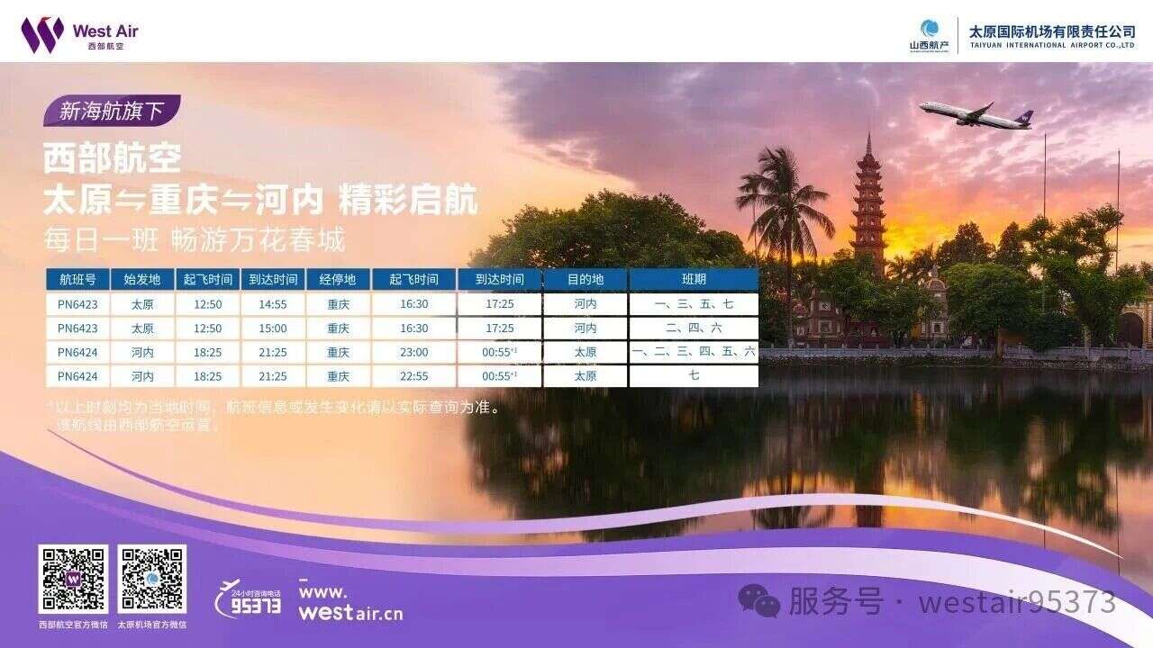 太原⇌重庆⇌河内4月20日首航 航空运输要闻 航线航班 4月15日 编辑 通讯员mk 取消关注 关注 私信 四月的风捎来了好消息 新海航西部航空 全新航线 太原⇌重庆⇌河内 即将在4月20日迎来盛大首航! 从表里山河的龙城 飞往红河畔的“东方小巴黎” 一条航线串联起两种截然不同的浪漫 相关推荐: 停飞6年后 成都直飞阿布扎比将复航 马来西亚国际航空新增深圳、长沙航线 首都航空将开通北京大兴往返里斯本直飞航线 新加坡航空将于2026年11月开通新加坡至西悉尼国际机场每日航班 重庆往返滨城独飞国际航线开通 西部航空国际航线航班