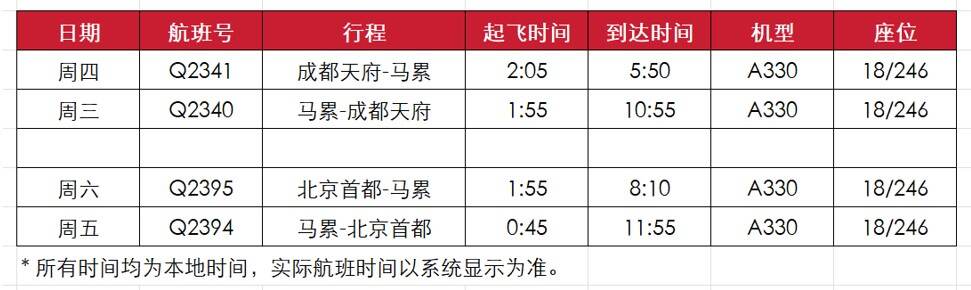 以上二条航线由空客A330宽体客机执飞,设有商务舱18座、经济舱246座, 充分满足高端旅游度假旅客的需求,也让中国西南及华北地区旅客可通过直飞航班便捷抵达马尔代夫。