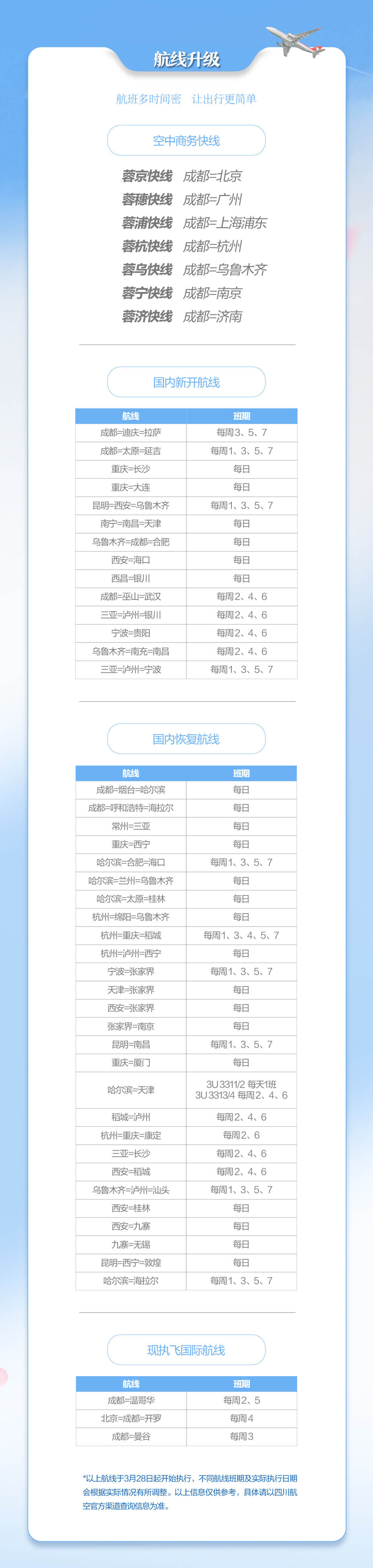 28日起,川航将加密成都出港公商务航线。其中,成都=北京每天最多达9班,成都=广州每天最多达6班,旅客购票可享“南川快线”自由变更、航程互换、值机通办等权益;成都=杭州每天5班,成都=上海浦东每天最多达4班,旅客购票可享“金熊猫一票通”蓉渝互换或沪杭互换免收变更费。此外,还有成都=乌鲁木齐每天4班,成都=南京每天4班,成都=济南每天4班。