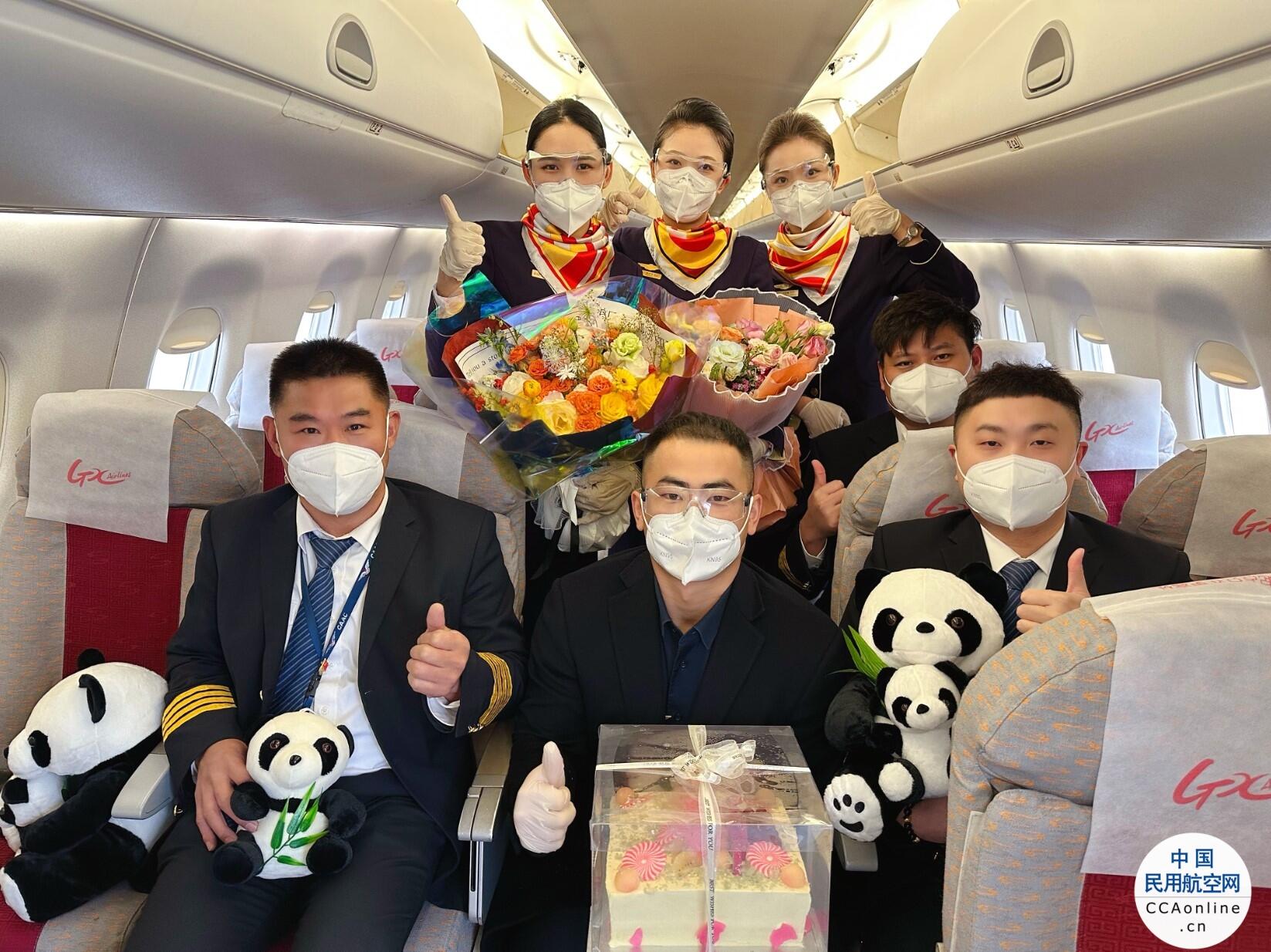 中国民用航空网讯(通讯员 张言坚)12月16日,海航航空集团旗下北部湾航空GX8973航班从南宁吴圩机场起飞前往陕西汉中机场,标志着北部湾航空南宁至汉中航线成功首航;在班机顺利抵达汉中机场后,汉中机场代表分别向机组成员献上鲜花及汉中大熊猫自然保护区特色伴手礼,并与首航机组人员合影留念。仪式简短而热烈,大家在首航航班上共同分享首航庆祝蛋糕。